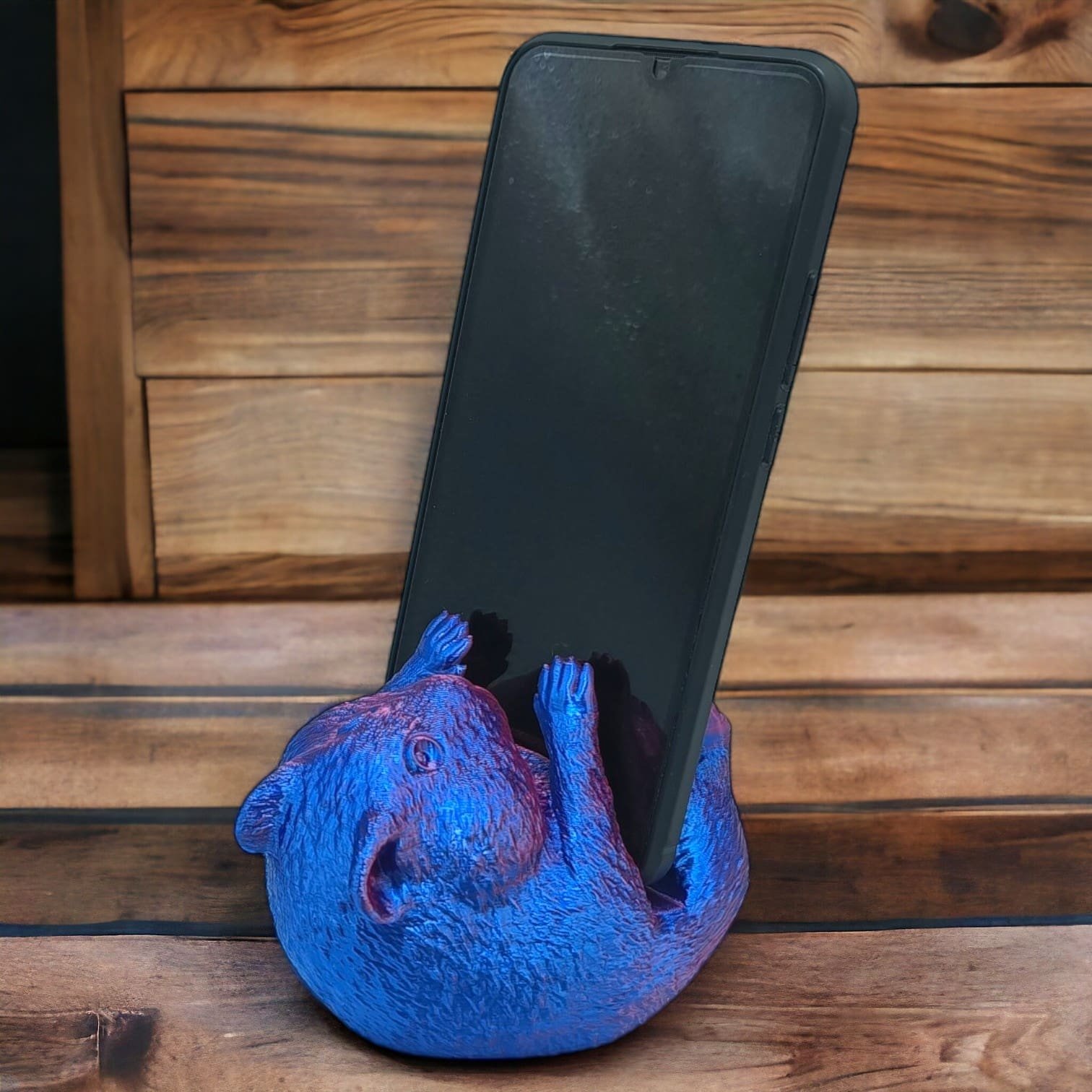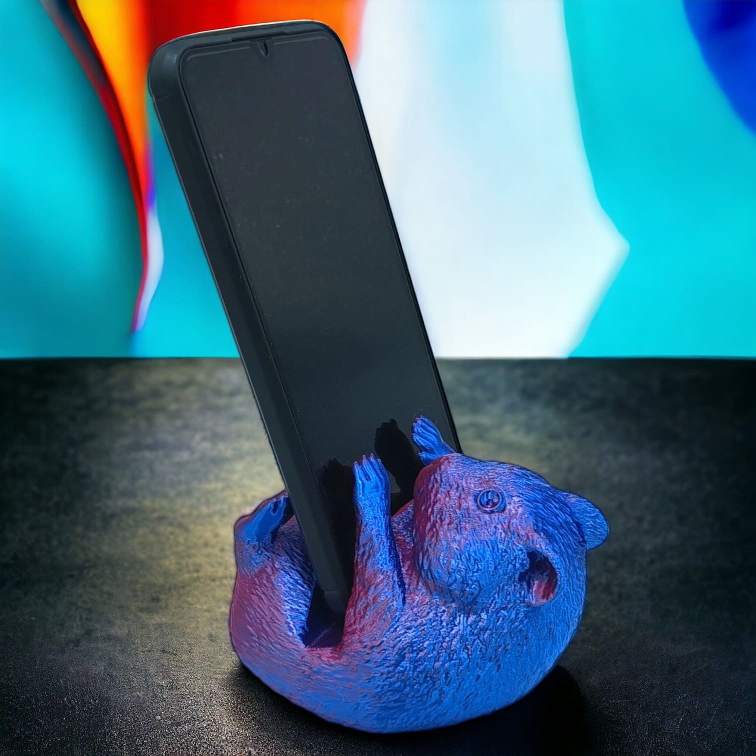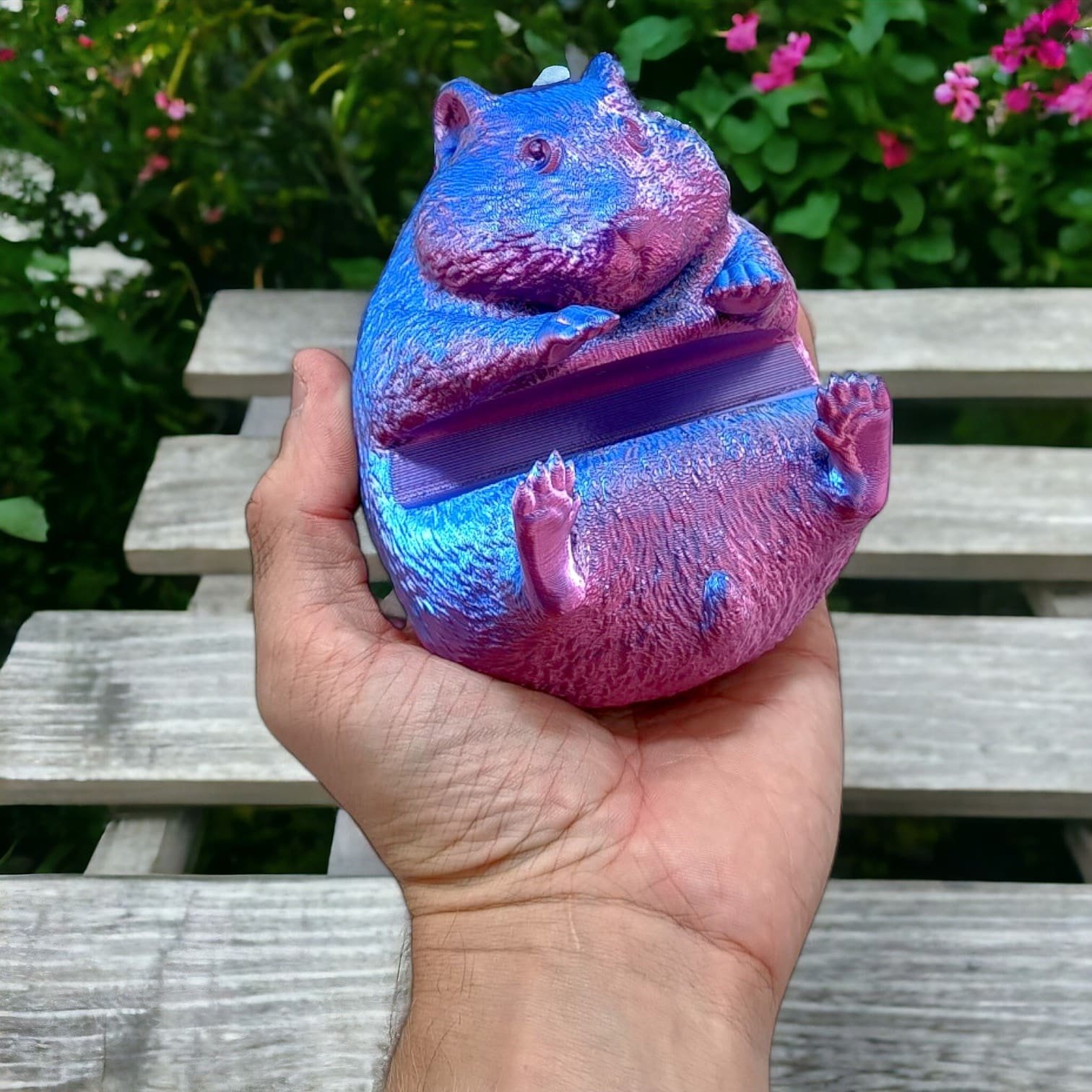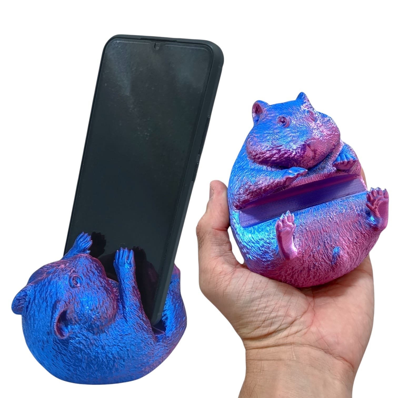 ⭐ Błyszcząca, wielokolorowa figurka chomika służąca jako stojak na telefon.