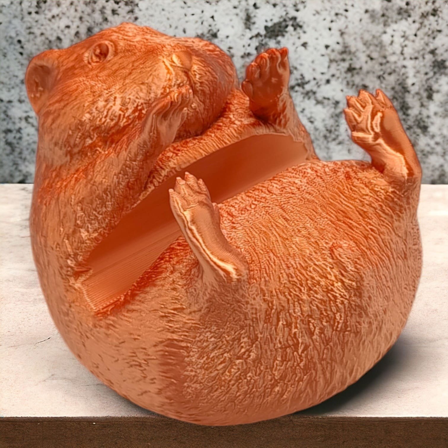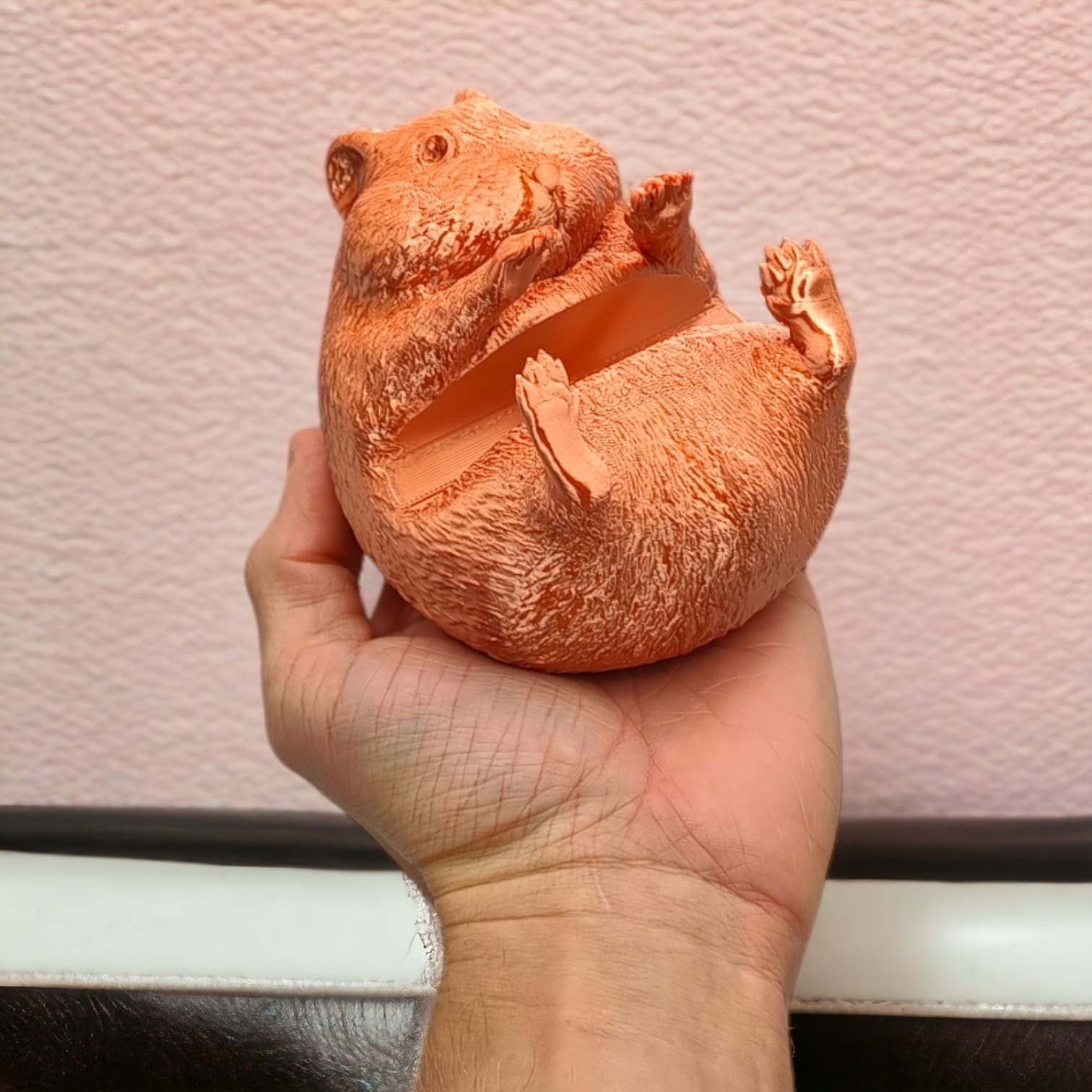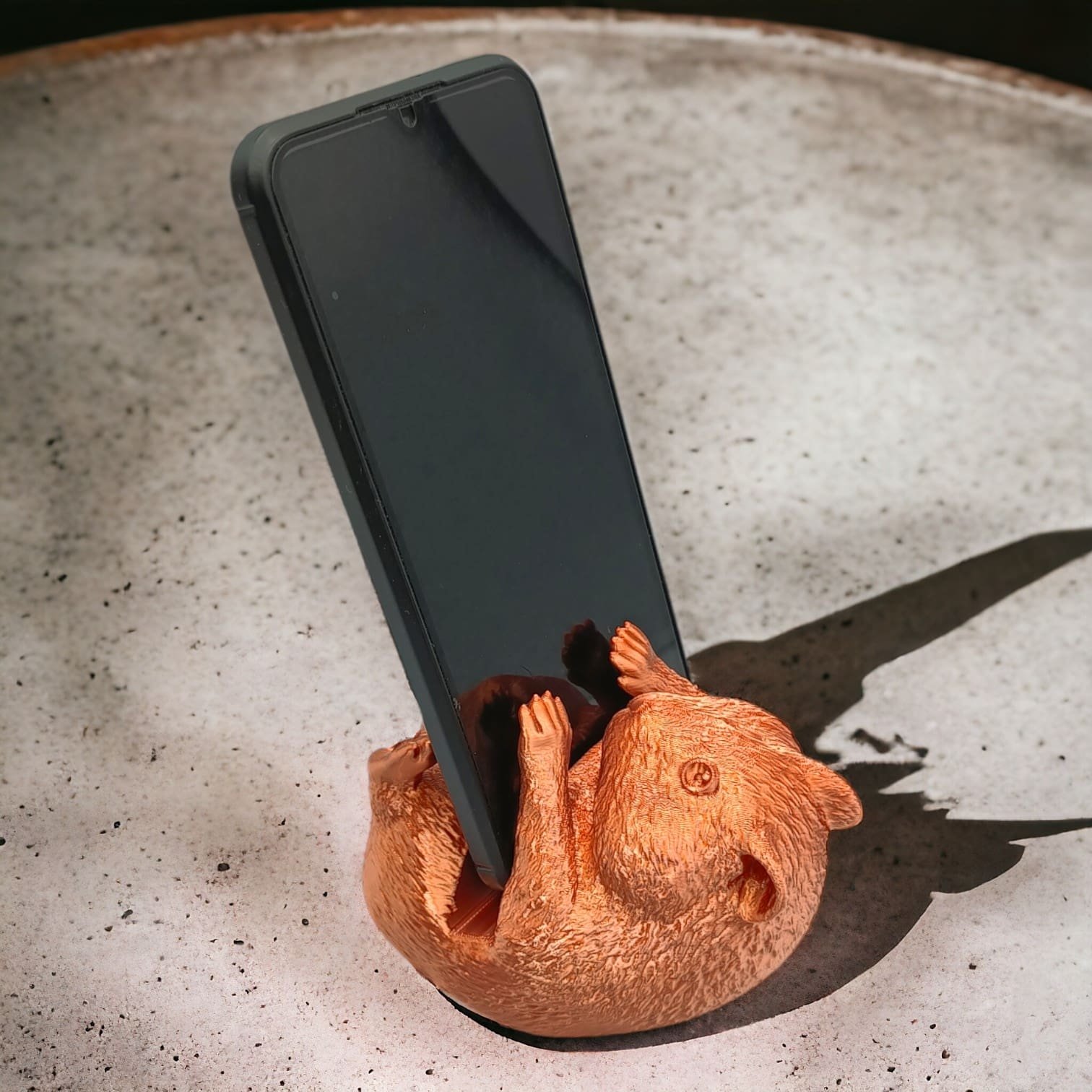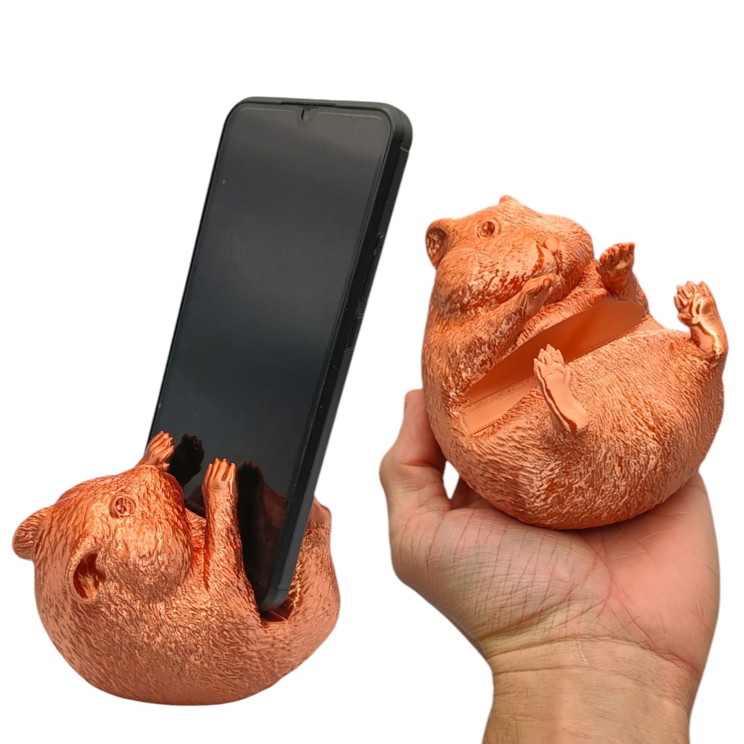 ⭐ Błyszcząca, figurka chomika w kolorze brązu służąca jako stojak na telefon.
