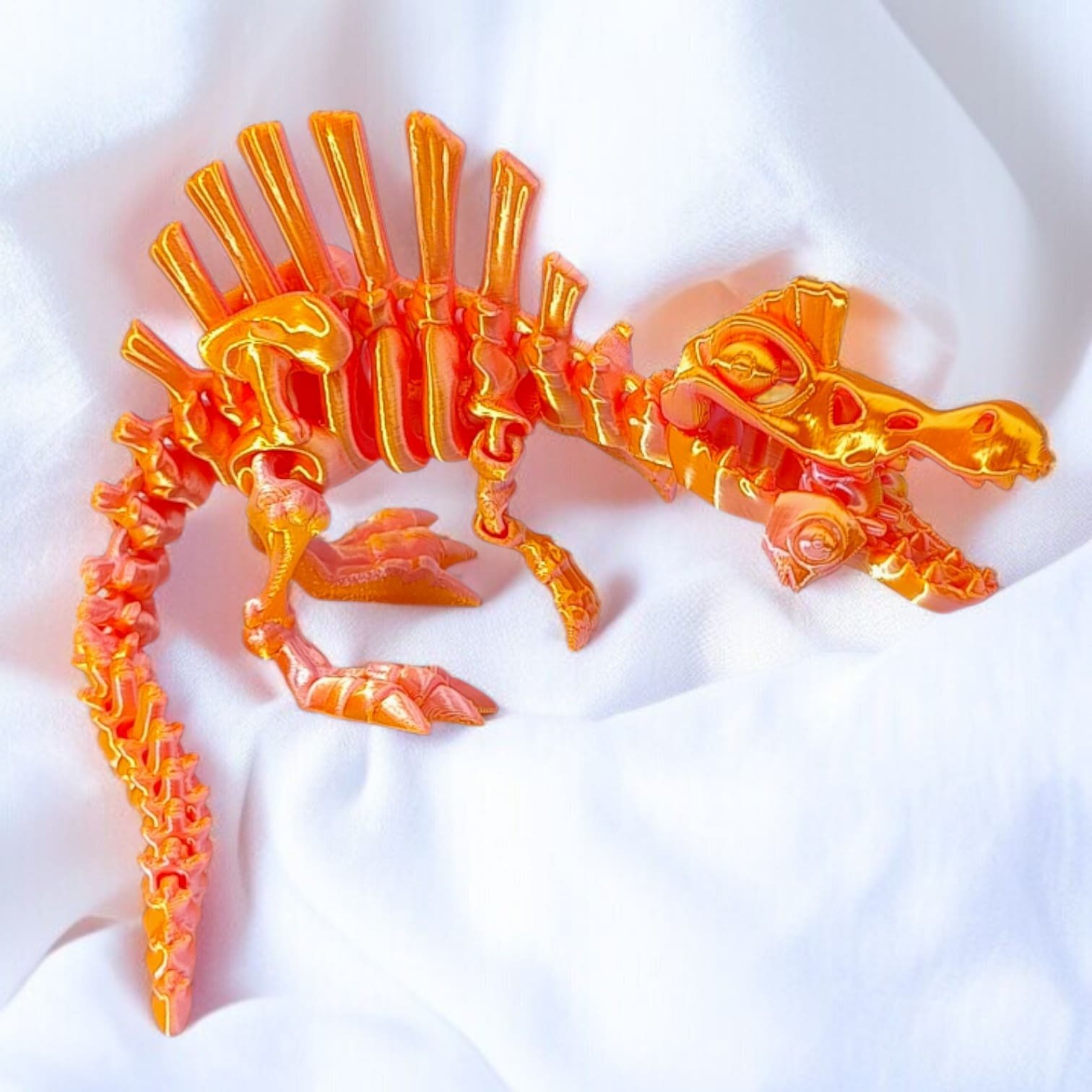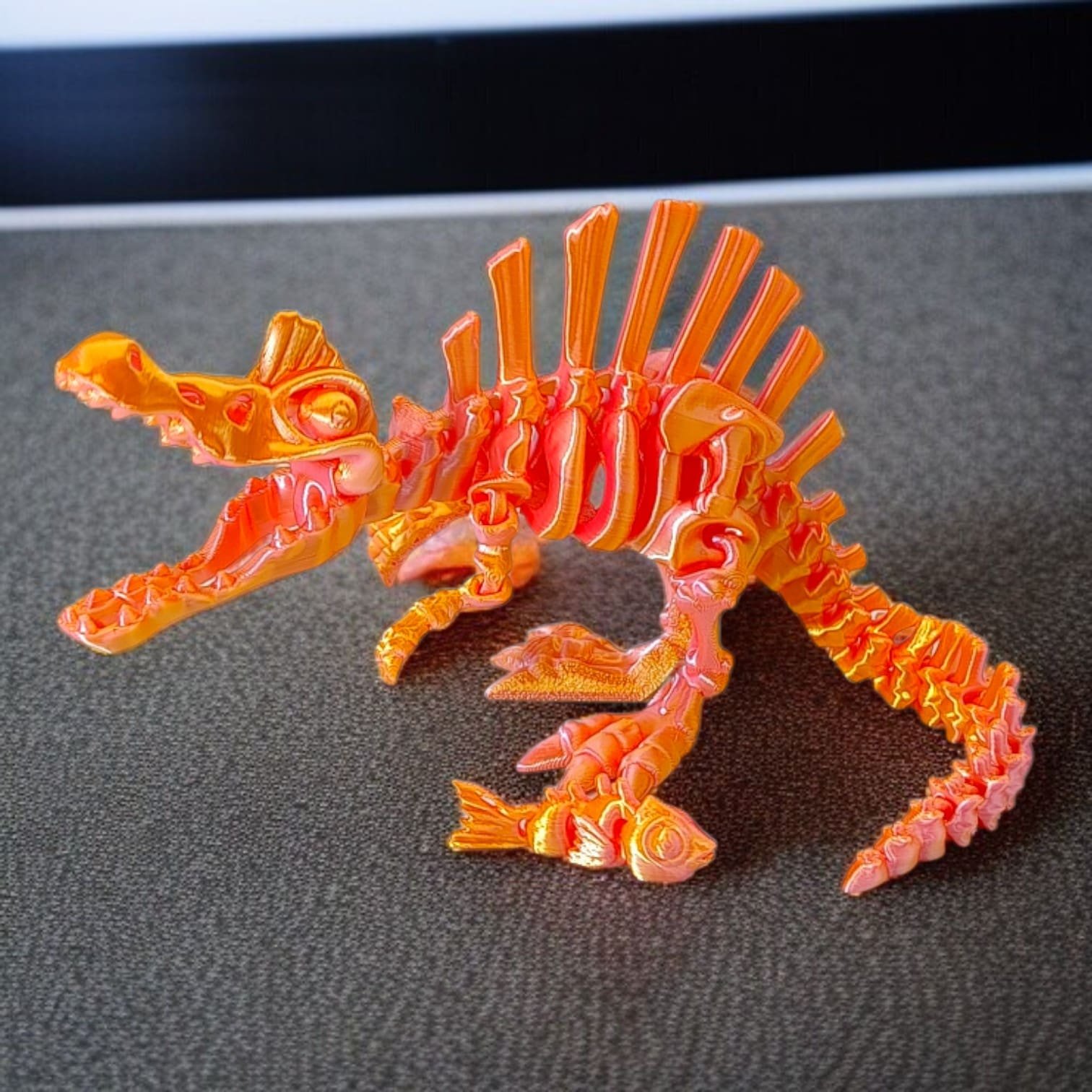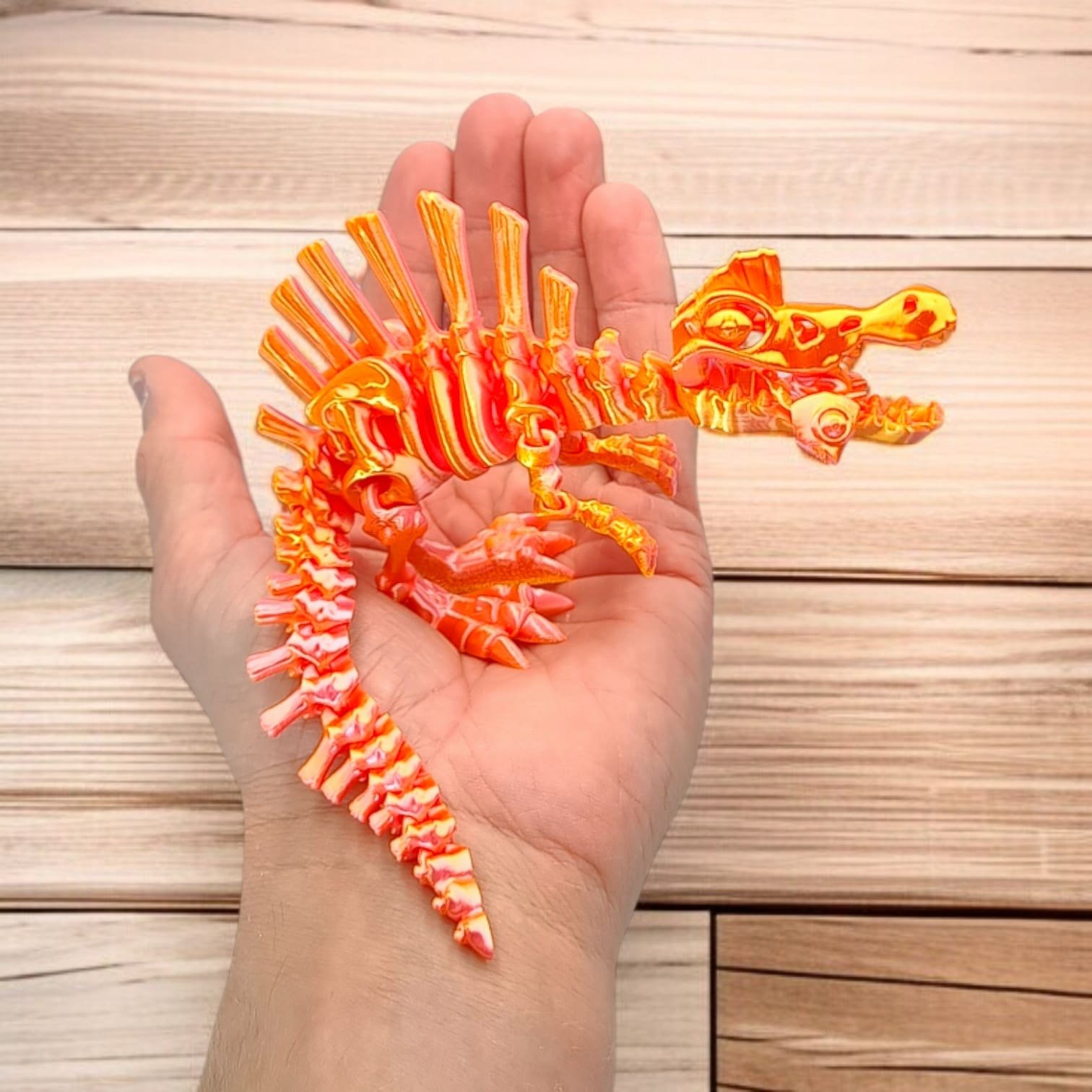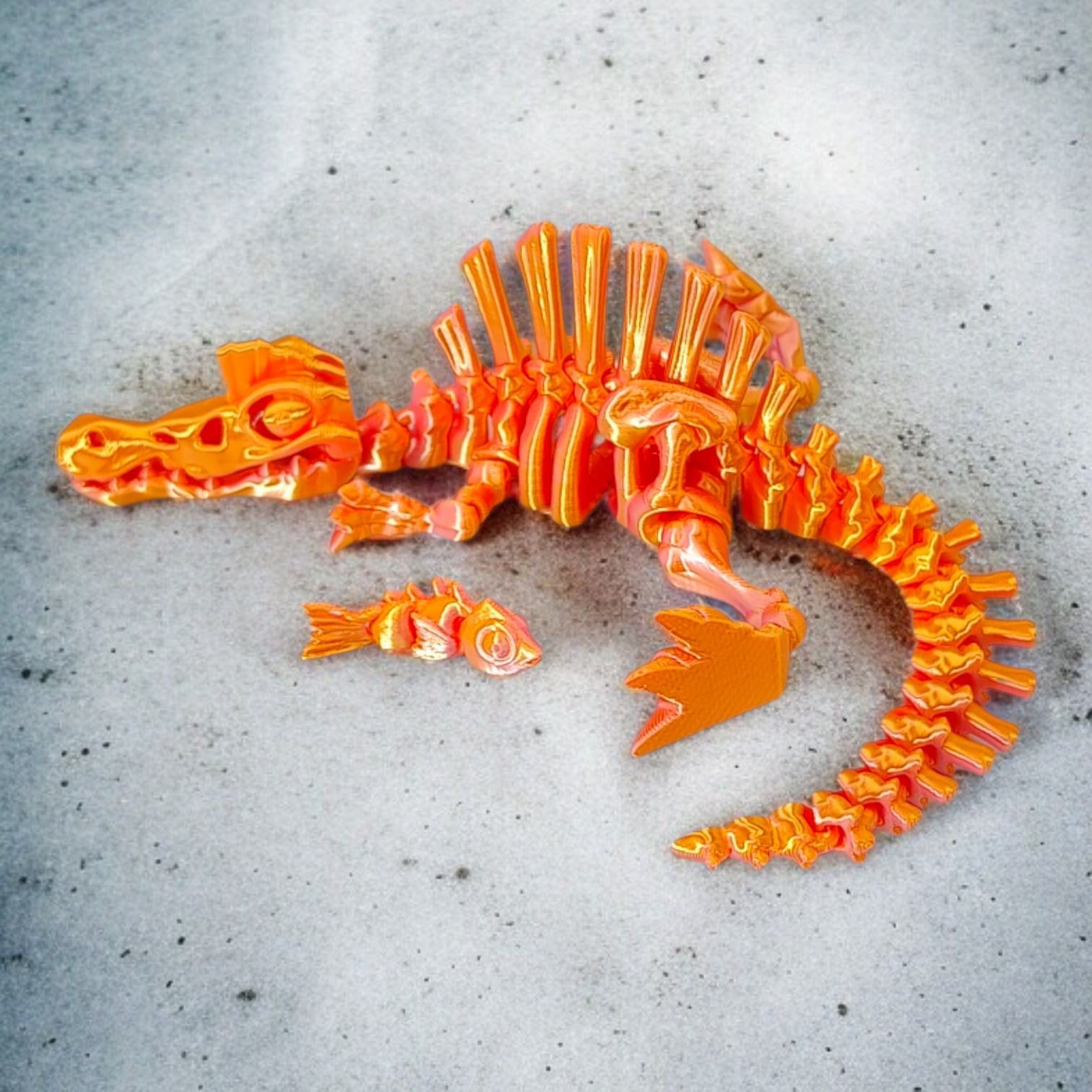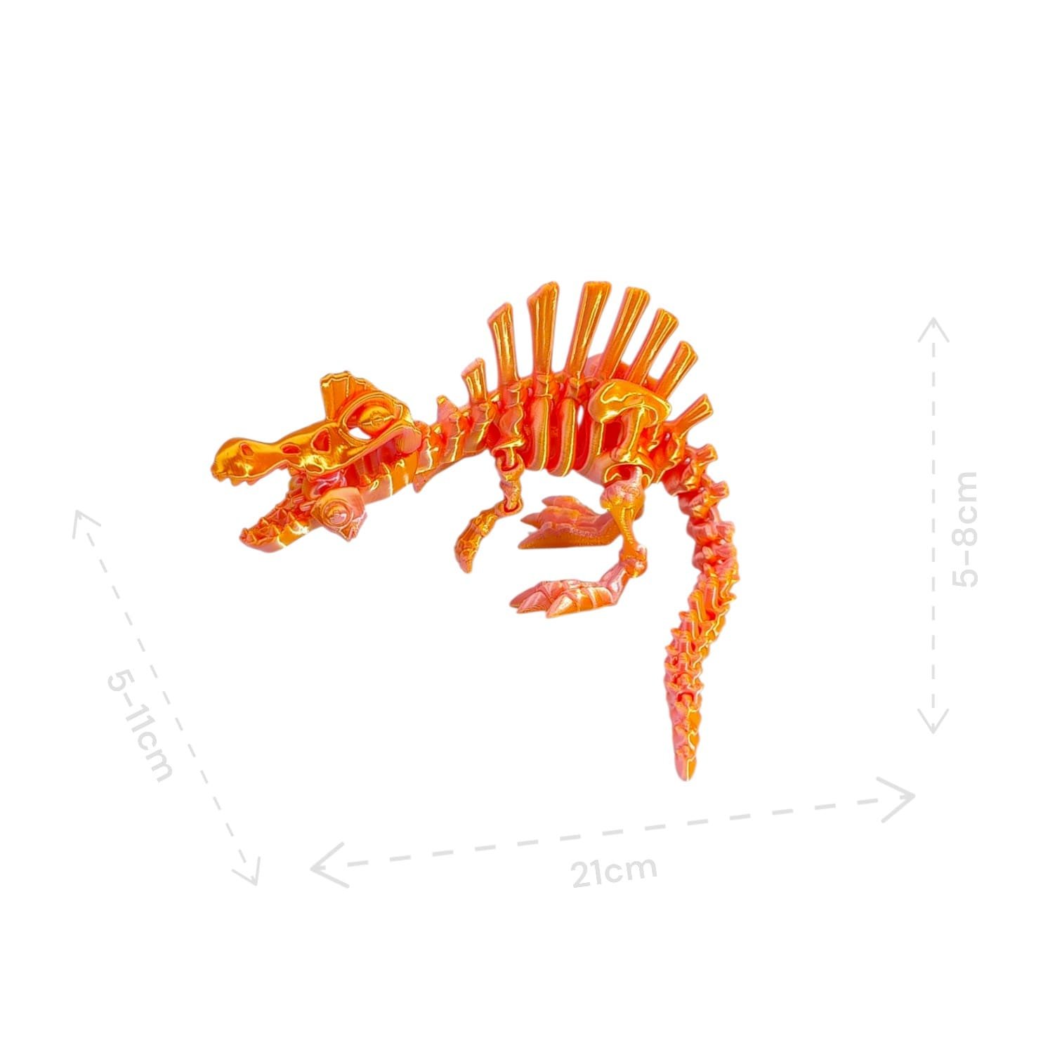 ➡️ Ruchoma figurka szkieletu spinozaura to imponująca miniatura prehistorycznego drapieżnika, pełna szczegółów i dynamicznej formy. Figurka przedstawia dokładnie odwzorowany szkielet spinozaura z charakterystycznym długim pyskiem, masywnymi szponami i rozpoznawalnym grzebieniem wzdłuż pleców. Każdy element jest w pełni ruchomy dzięki przegubom, co pozwala na ustawienie dinozaura w różnych, realistycznych pozach, dodając mu życia i dynamiki.
