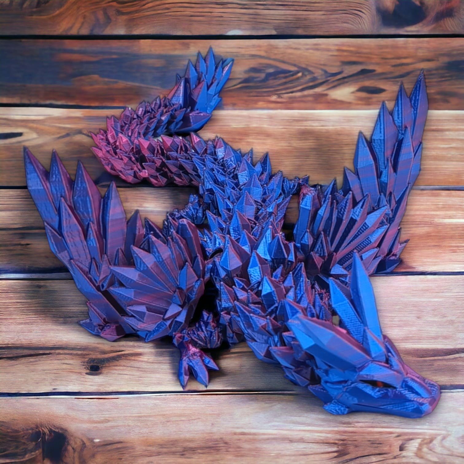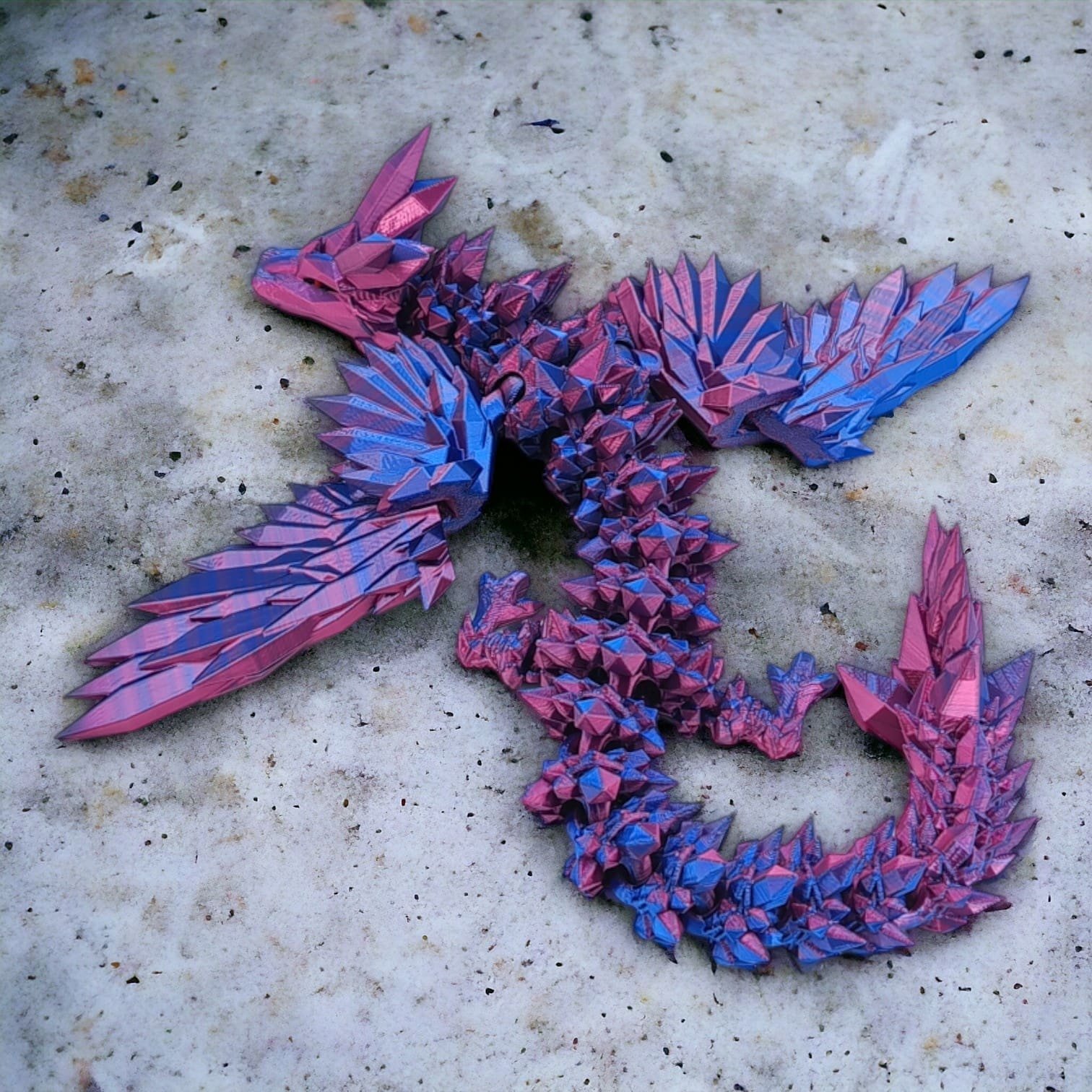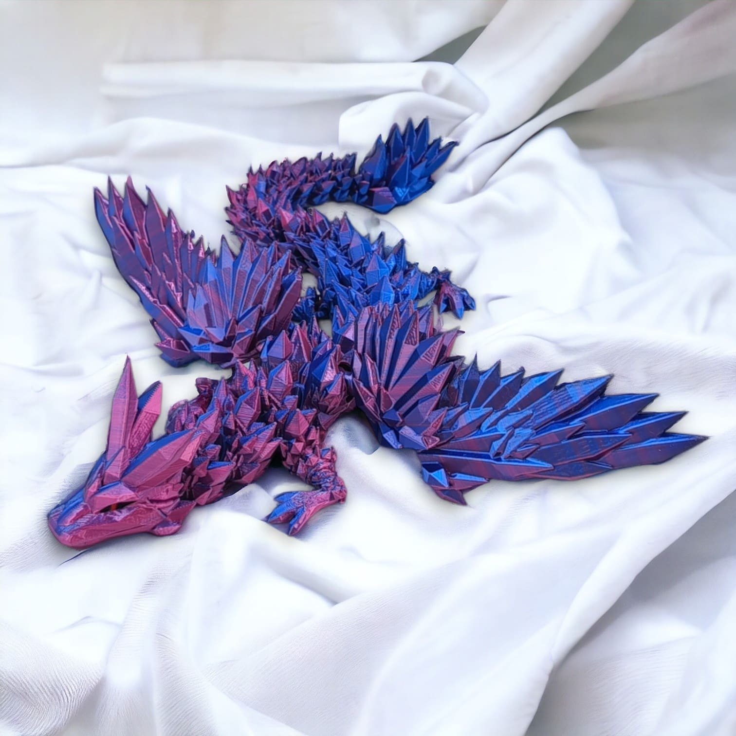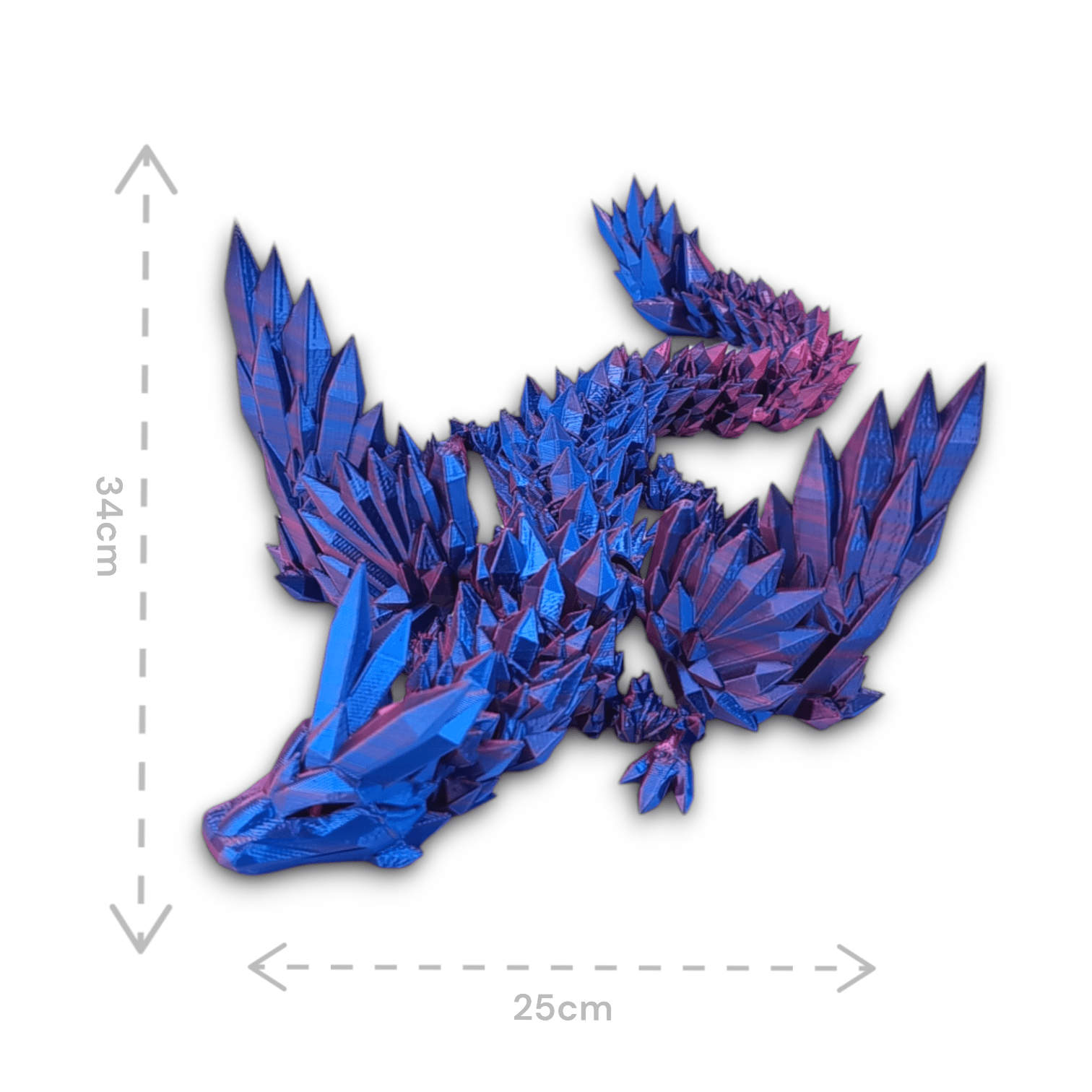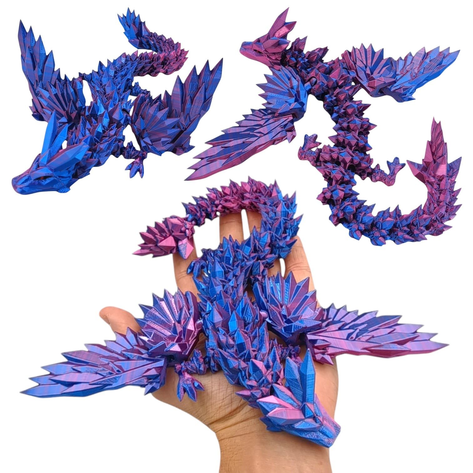 ➡️ Średni smok przegubowy ze skrzydłami to istota niezwykła, która emanuje delikatnym blaskiem fuksjowo-niebieskich kryształów, które składają się na jego ciało. O długości 34 centymetrów, wydaje się być jak magiczna klejnotowa figurka, która ożywa w twoich dłoniach.