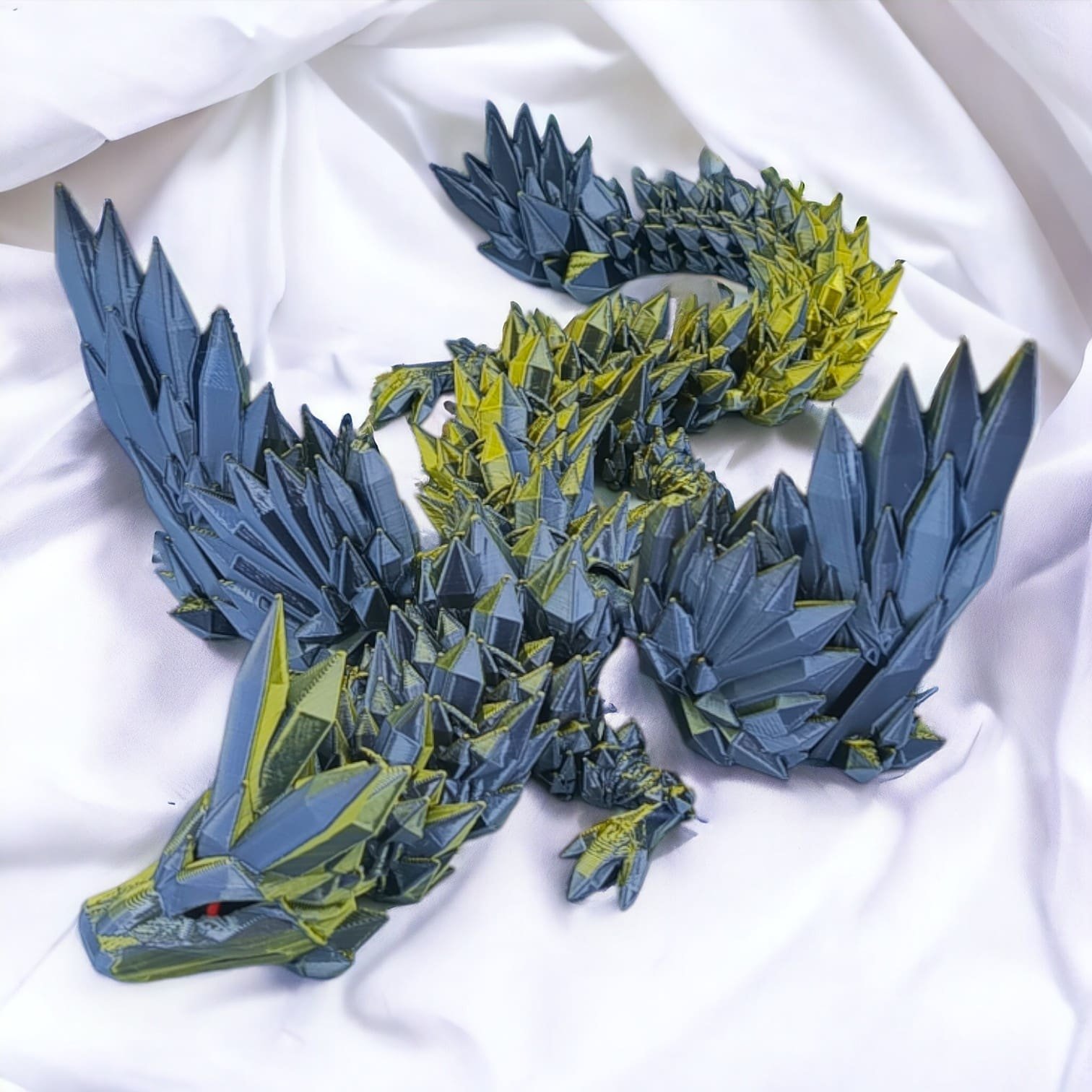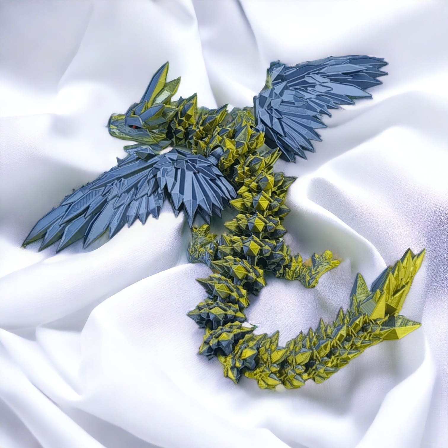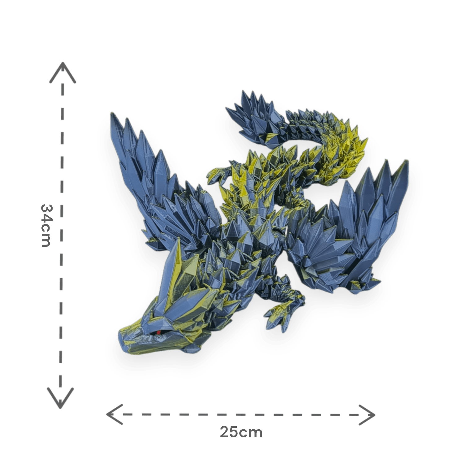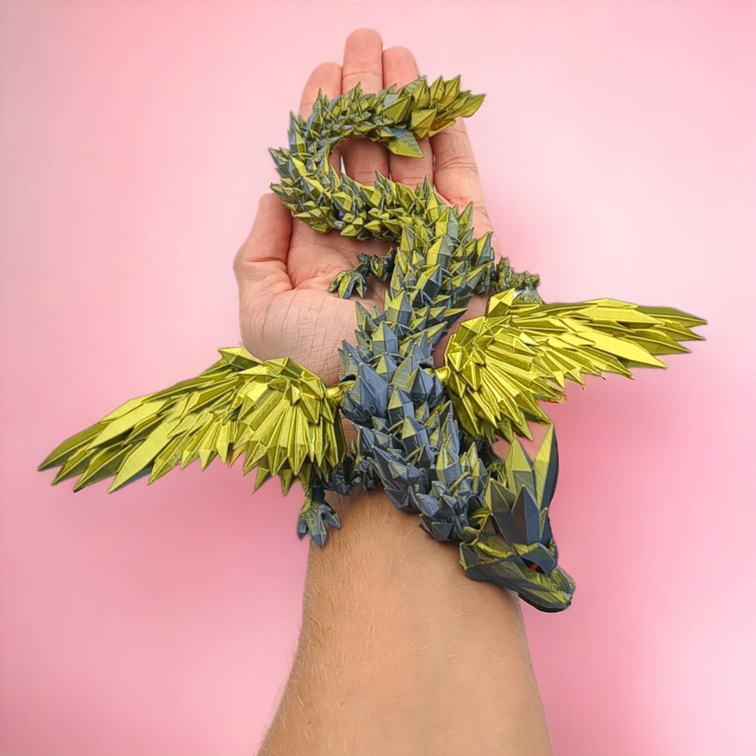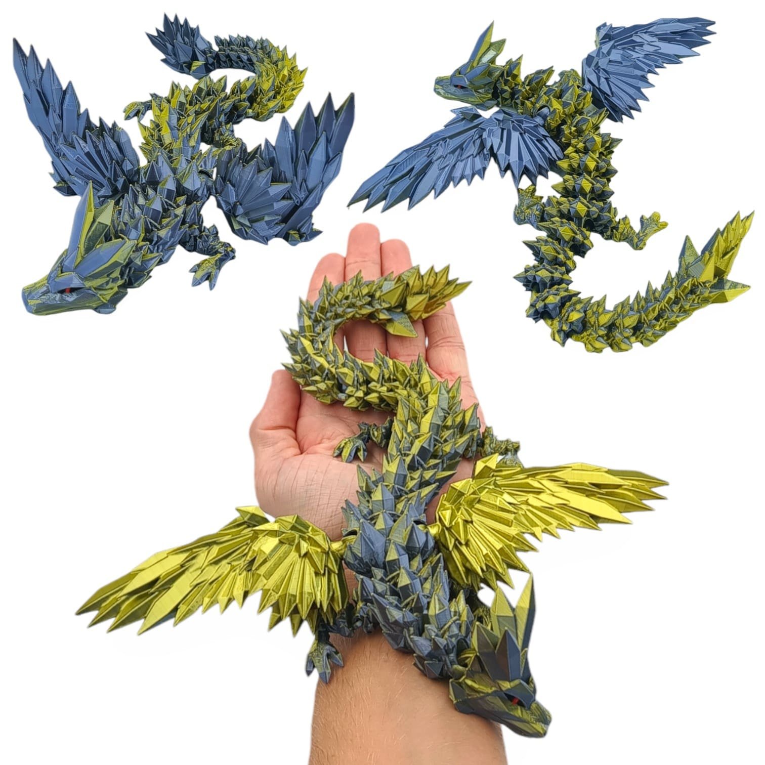 ✅ Średni smok przegubowy ze skrzydłami to istota niezwykła, która emanuje delikatnym blaskiem złoto-czarnych kryształów, które składają się na jego ciało. O długości 34 centymetrów, wydaje się być jak magiczna klejnotowa figurka, która ożywa w twoich dłoniach.