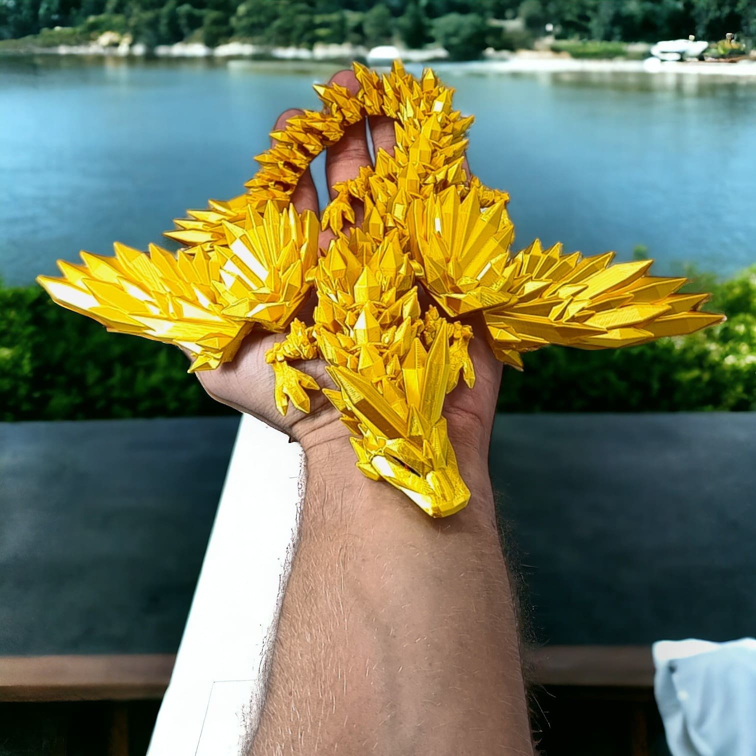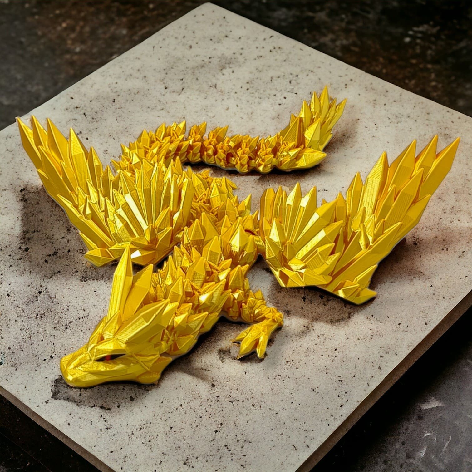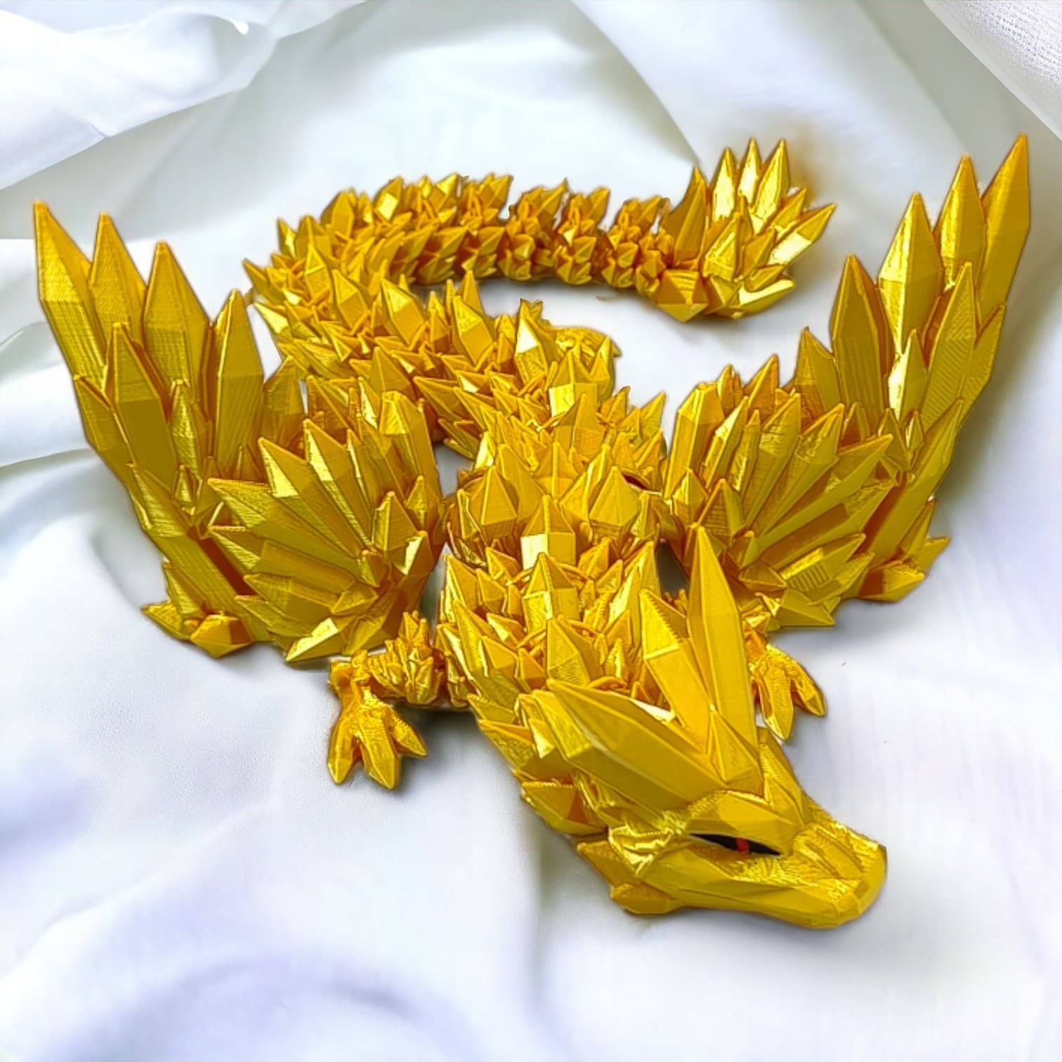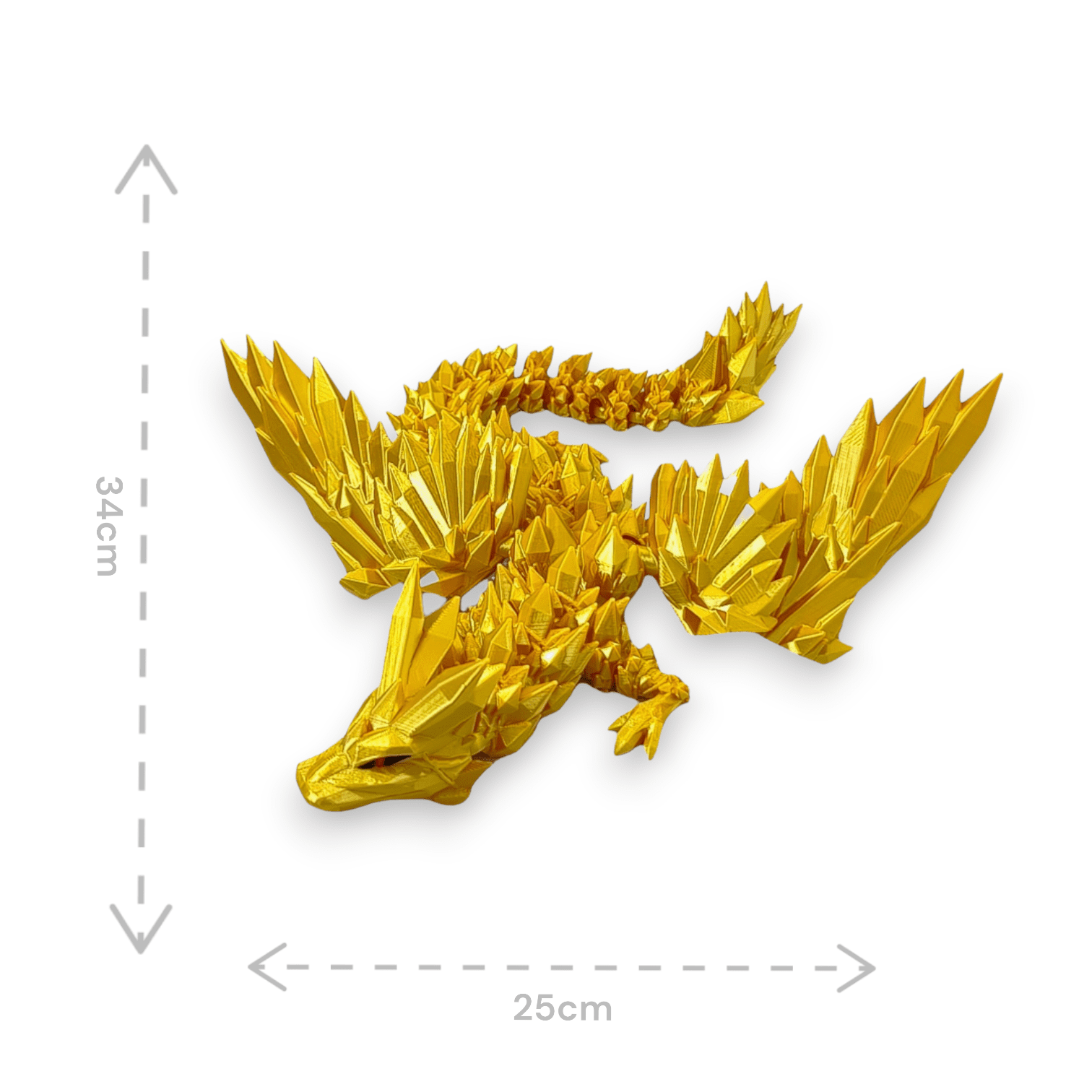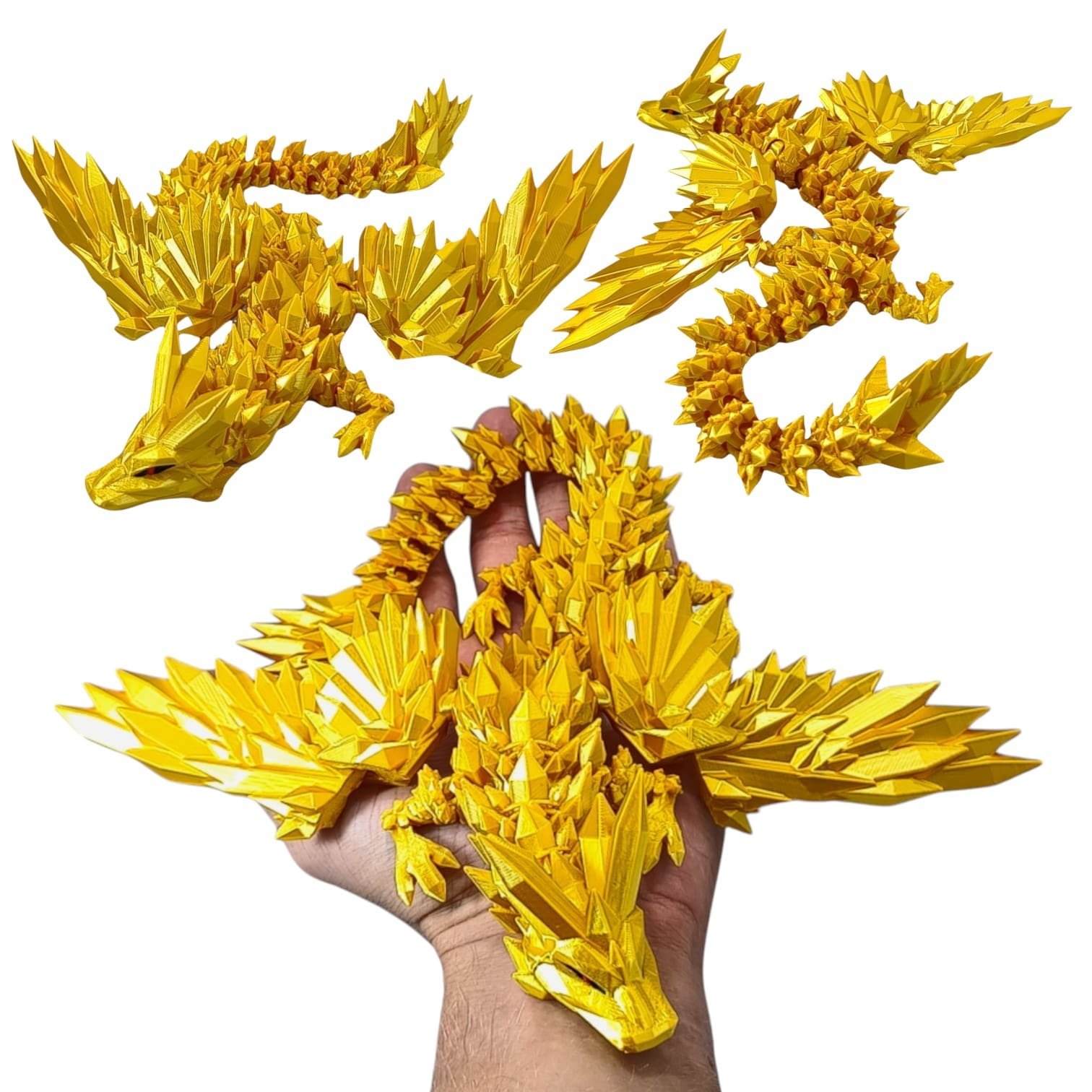 ➡️ Średni smok przegubowy ze skrzydłami to istota niezwykła, która emanuje delikatnym blaskiem złotych kryształów, które składają się na jego ciało. O długości 34 centymetrów, wydaje się być jak magiczna klejnotowa figurka, która ożywa w twoich dłoniach.
